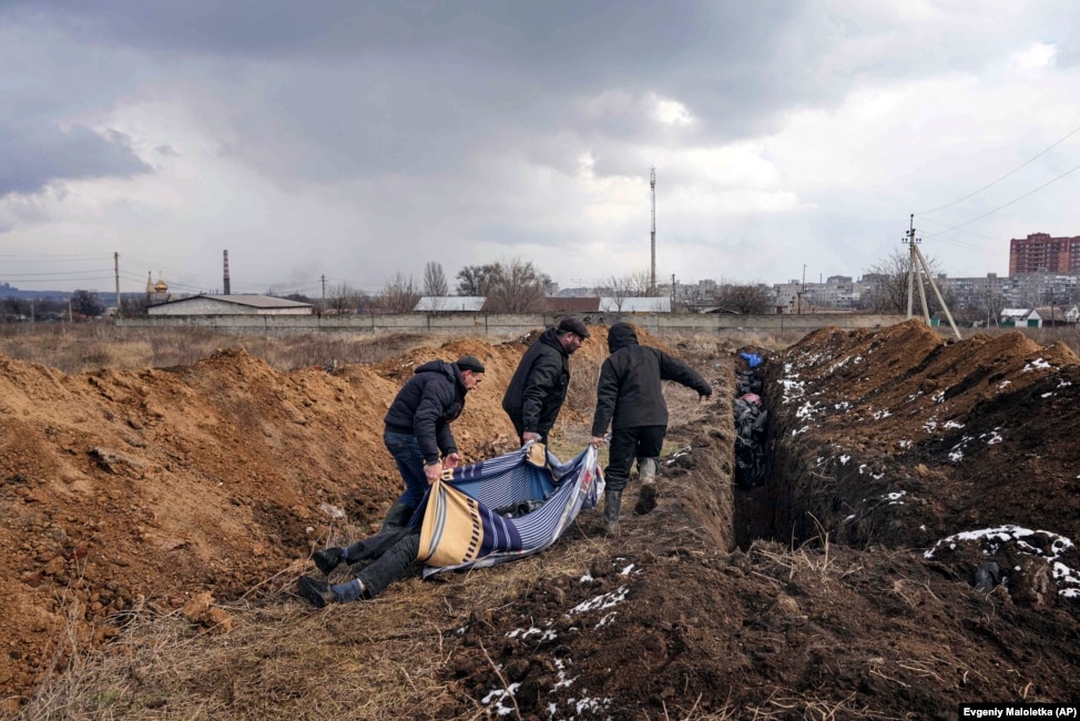 Tres individuos arrastran cadáveres a ser depositados en una larga fosa común en las afueras de Mariúpol, el 9 de marzo.